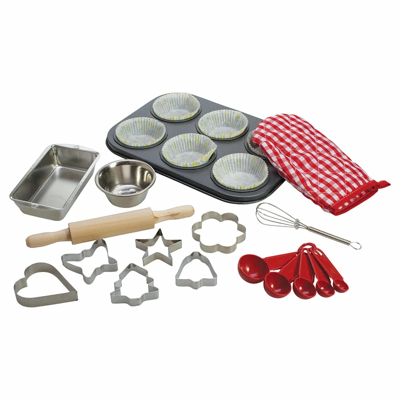 This 23 piece Baking Set is a perfect addition to any kitchen. The set is the ideal starter kit to introduce kids to all kinds of cooking and baking. Includes a 6 hole muffin baking tray, a silver ramekin, loaf tin, a whisk, a wooden rolling pin, 6 pastry cutters, measuring spoons and an oven glove.Β