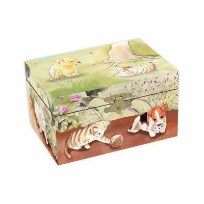 Specially designed to be cherished for years, this Music Box by Enchantmints features original artworks of playful pets. The top of the box depicts a dog and a cat playing with a ball. Inside the box is a mirror with cat spinning in front. This music box has a compartment where all sorts of treasures can be stored. The box closes securely thanks to a delicate gold coloured clasp and well-made draws. Dimensions are 15.5W x 9H x 12Dcm.Β
