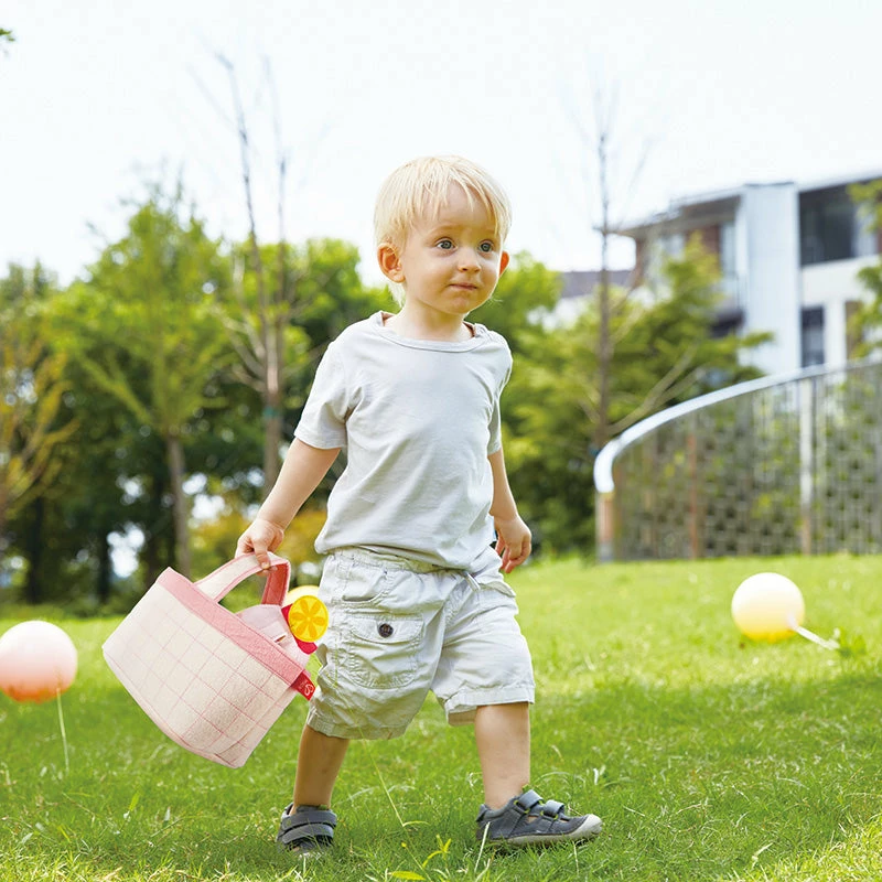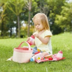 The set comes with 1 x fabric picnic basket, 1 x picnic cloth, 3 x play drink bottles, 2 x strawberries, 2 x pieces of bread, 1 x lettuce leaf, 1 x slice of tomato and 1 x slice of cheese.