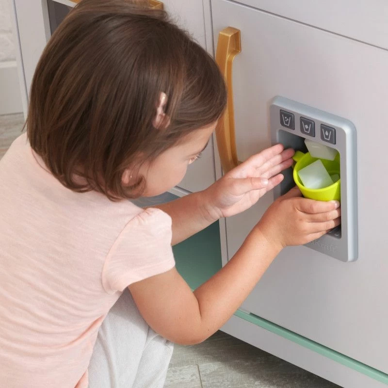 Whether they’re baking a bubble gum pie in the charming oven with a showcase door, frying up a purple turkey on the stovetop with realistic lights and sounds, or using the ice maker that dispenses play ice cubes, kids are going to love playing in this vintage kitchen.