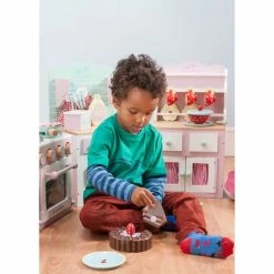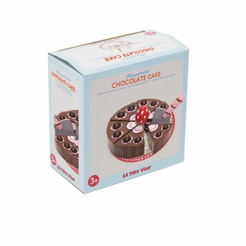 Did someone say morning tea? This chocolate cake from Le Toy Vanβs Honeybake range is sure to draw a crowd. With Velcro joining the six painted wooden pieces together, just use the supplied cake slicer to βcutβ them up and serve them to your hungry guests. Thereβs a delightful cherry on top as a nice finishing touch. This cake is packaged in an attractive cardboard box, making it a great gift option. It even has a doily on the bottom of the box that can be cut out with help from mum or dad. Cake diameter β 13cm.Β