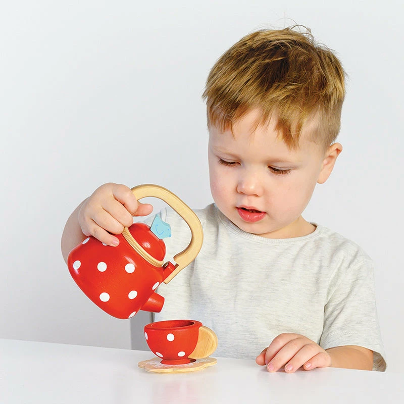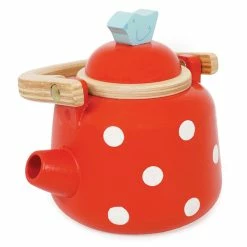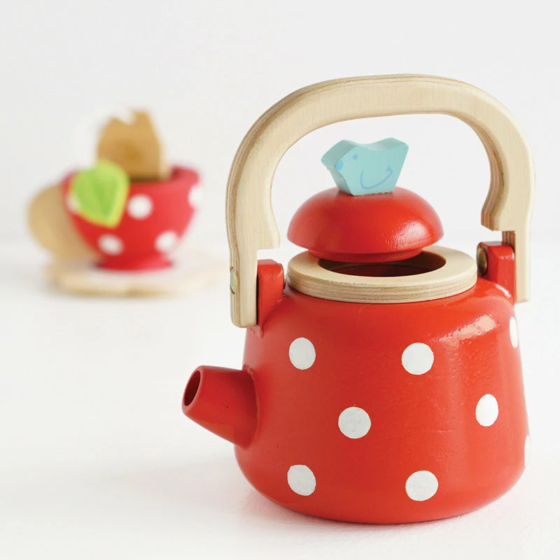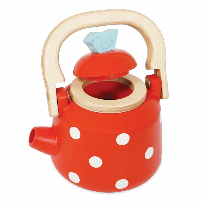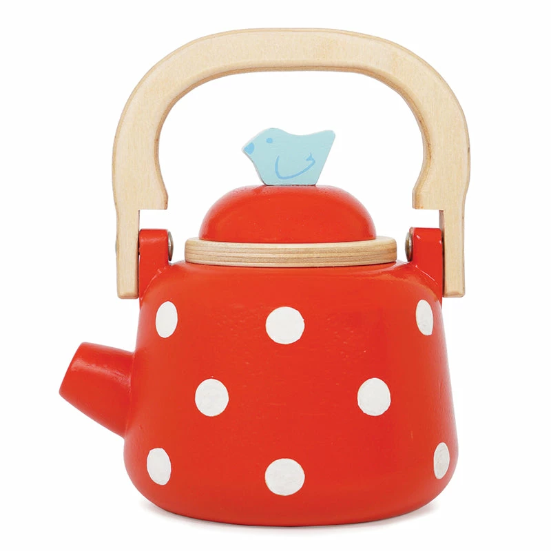 Every great day is started with a cup of freshly brewed tea or coffee in the morning! This lovely red and white spotted kettle features an opening lid and an adorable little bird at the pouring tip. Made of ethically sourced wood and finished with non-toxic paint.Β