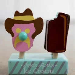Mums and dads will remember these childhood classics from the 70’s, 80’s and most are still around today. Undoubtedly Australian these ice creams are seriously now iconic. The set comes complete with 4 wooden toy ice creams, wooden block stand and 3 little paper bags for wrapping your ice creams in.