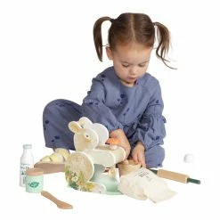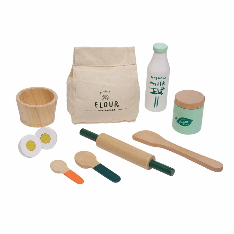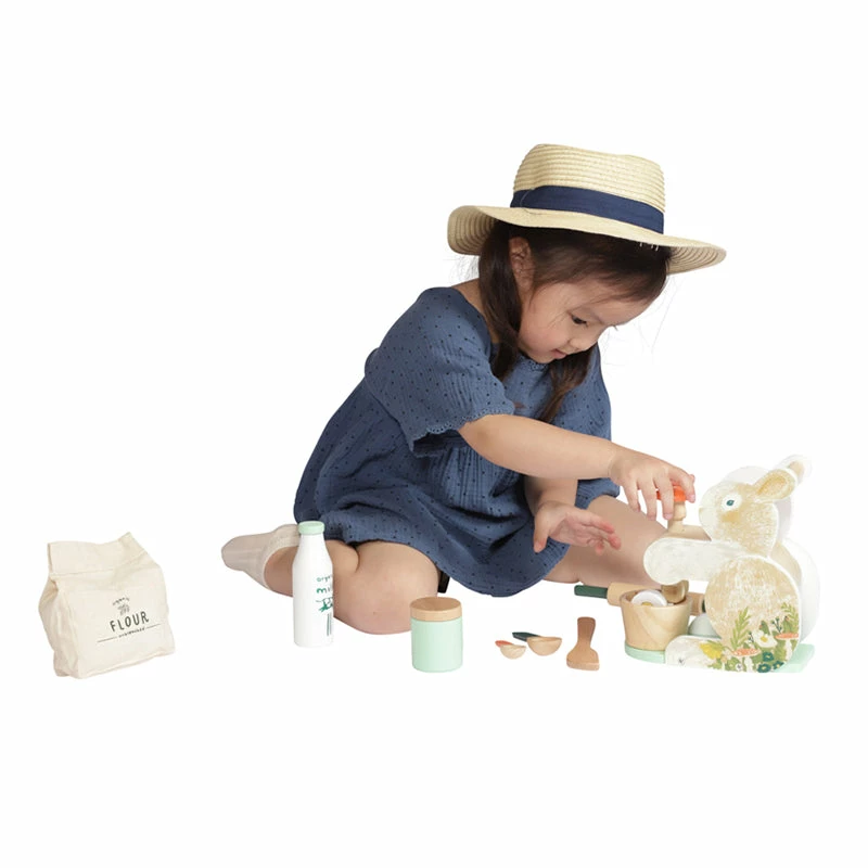 Perfect for pretend play, the set comes with 1 bunny themed mixer, 1 mixing bowl, 1 small spoon, 1 large spoon, 1 rolling pin, 1 spatula, 1 sugar jar with removable lid, 1 milk bottle with removable lid, 1 egg (that splits in 2) and 1 fabric flour bag.