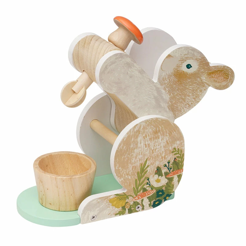 The design features a pull back on the handle between the bunny’s ears to liftΒ the wooden mixer. Spin the mushroom on the mixer to turn the blades.Β