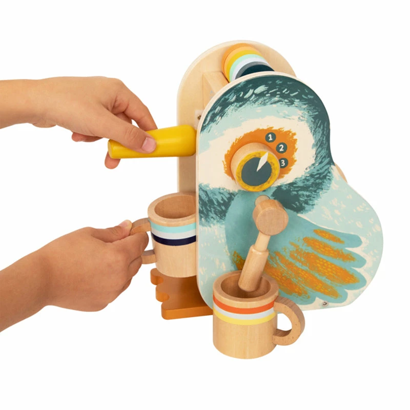 This beautiful kookaburra designed 11 piece espresso coffee machine will look amazing in anyΒ play kitchen. Complete with 1 bird shaped espresso coffee maker, 1 portafilter, 2 cups and 7 espresso pods (which fit in the portafilter and cups).