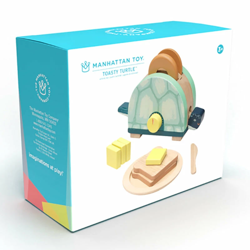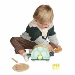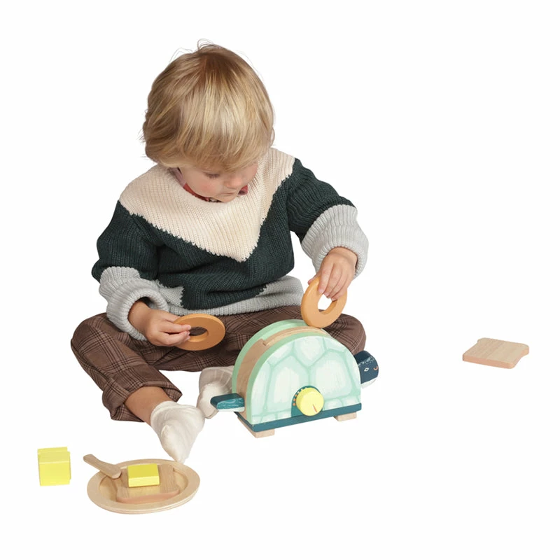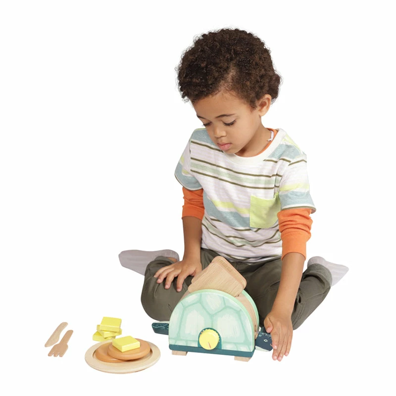 Perfect for pretend play, the turtle toaster comes with 1 plate, 2 slices of toast, 2 bagels, 1 butter knife and 4 slices of wooden butter. I’ll have a bagel please!