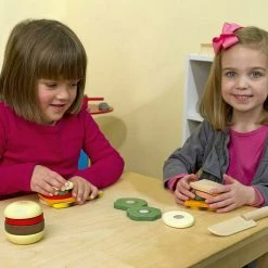 Anyone for a nice healthy lunch? Children will have lots of fun making their own meals just the way they like them with this wooden Sandwich Making Set from Melissa & Doug. Stack your sandwich with the Velcro wooden pieces, then use the wooden knife to slice it apart β a satisfying βcrunchβ sound proves that your ingredients are fresh! The included wooden storage tray is perfect for keeping it all organised between meals and includes some extension activities on the back. This pretend play toy is great for developing imaginations, plus teaching fine motor skills, eye-hand coordination, and introducing a variety of healthy foods. Bread height β 7cm.