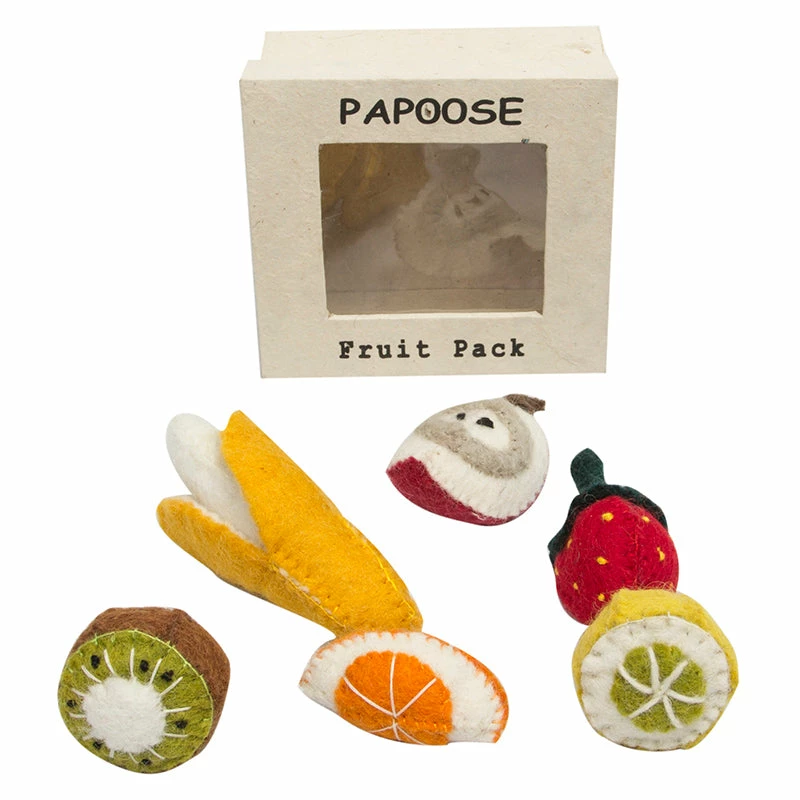 The fabulous little Fruit Set from Papoose Toys is fantastic for pretend play. You will find 6 differentΒ fruitsΒ including a banana, apple wedge, orange wedge, strawberry, half a lemon and half a kiwi fruit. All stored in a box made from recycled paper.Β Papoose uses 100% pure wool handmade felt and non toxic colourfast dyes.Β
