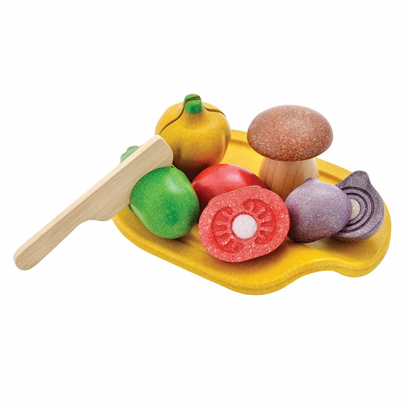 This assorted wooden vegetable setย from PlanToys is a great addition to any kitchen. The set includes a cutting board, knife and 5 sliceable vegetables (cucumber, tomato, onion, mushroom and shallot).ย