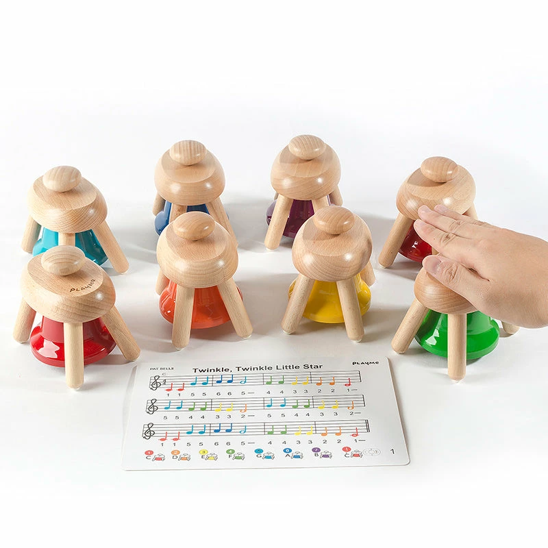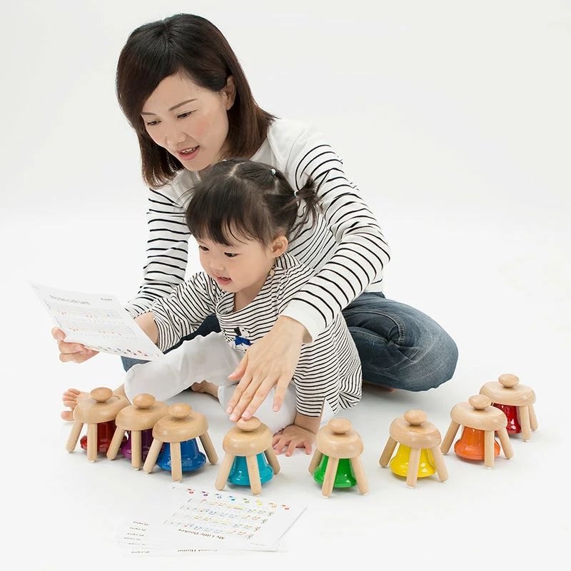 There are 8 individual standing Pat Bells in this high quality beautiful set.Β Each of the beech wood bellsΒ represents one of the C Major tones. Simply pat the wooden top of each bell allowing making music to be simple and fun.Β Β There is an instruction guide included with pre-made rhythms or you can create your own. The bells come stored in a sturdy red box.