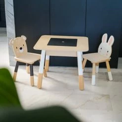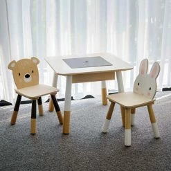It also comes with the cutest woodland animal chairs, one rabbit themed and the other bear themed.ย