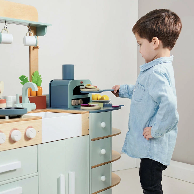 Calling all budding Masterchef’s! The amazing La Fiamma Grand two part kitchen from Tender Leaf Toys has everything you need to cook up a feast. The stunning design features a sink and cooker with backboard, range hood, oven with grill and 4 turning knobs, a storage unit with a pizza oven and a double door storage unit under the sink.
